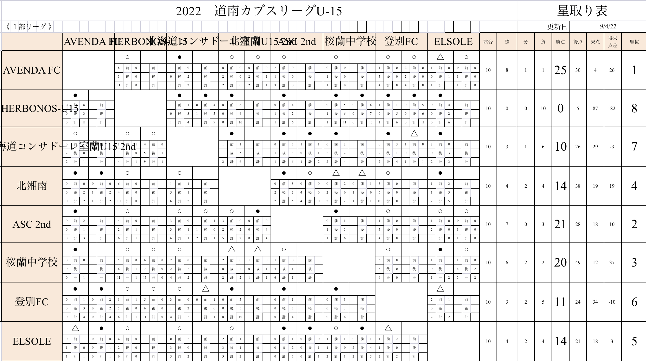 2022 道南カブスリーグU-15 途中結果