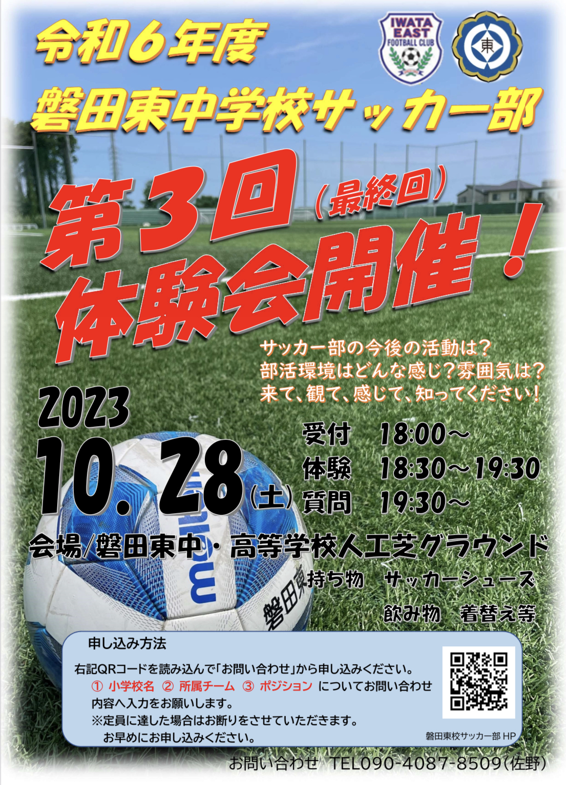 今、なぜ?中学校部活を復活させるのか?という疑問をお持ちの方も少なくないと思います。昨今、文科省・スポーツ庁主導で部活動の地域移行が進んでいる現状です。そのタイミングで私立中学校のできること。健全な青少年を育て、充実した教育環境を提供できないのか、という「原点回帰」が大きな理由です。磐田東中サッカー部は@時間の有効活用A中高連携Bハード面の充実C指導スタッフの充実を約束し、新たなスタートを切ります。是非、興味のある人は第3回体験会に参加してください。申し込みはリーフレットのQRコードを取り込みそこから申し込みをしてください。