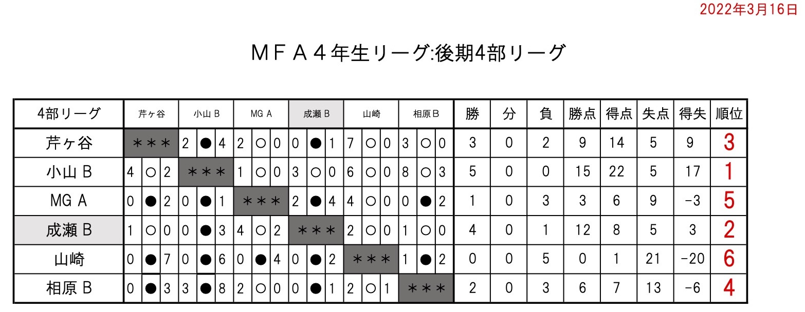 MFA4年生リーグ後期4部が終了しました
