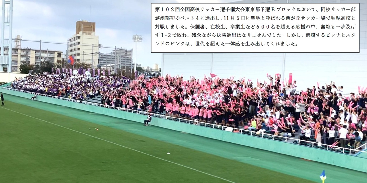 部活を通した人間教育実現の為、勉強とスポーツの両立を目指すことが前提です。但し、各種公式大会に出場するので,これらの勝利、更には全国大会に出場する為に体力と技術の鍛錬に励むことを目的としています。生徒には「一に学習,二にサッカー,三・四がなくて五に遊び」(優先順位)の心構えを持つように指導しています。