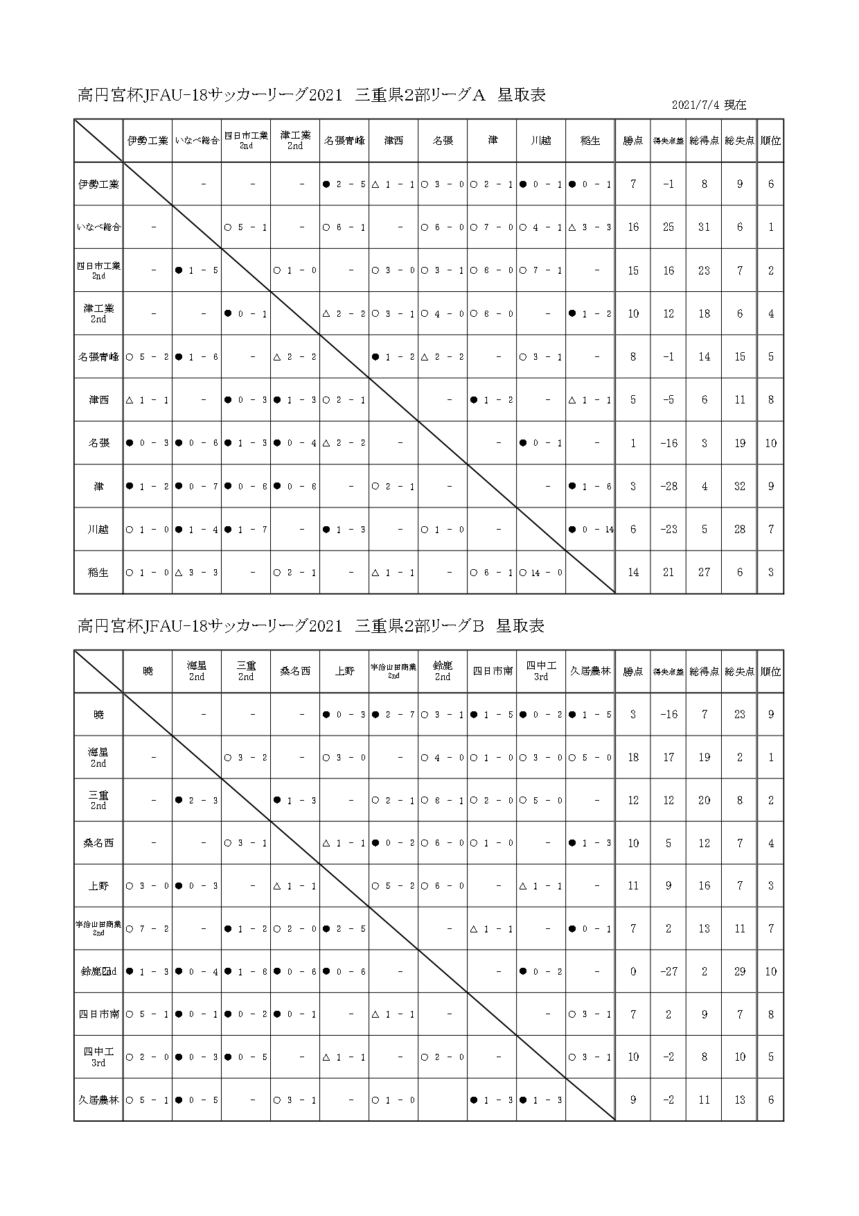 【Sat?】高円宮杯JFAU-18サッカーリーグ2021三重県2部 星取表