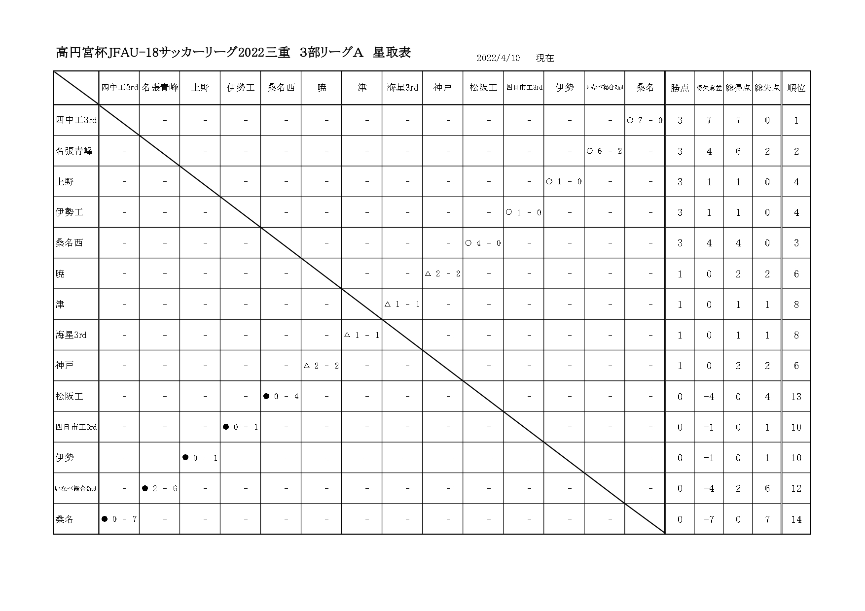 【Sat?】高円宮杯JFAU-18サッカーリーグ2022三重県3部 星取表