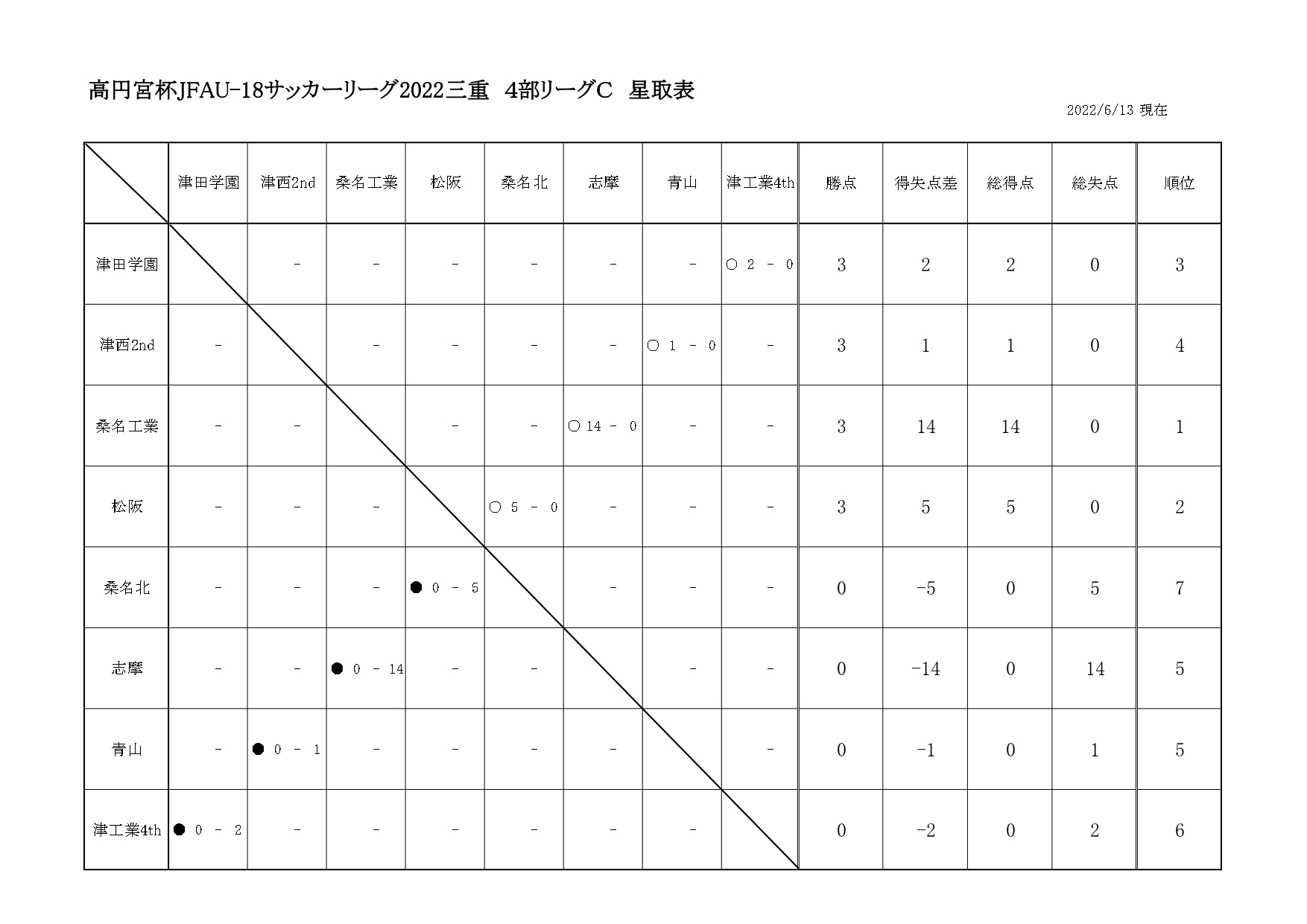 【Sat?】高円宮杯JFAU-18サッカーリーグ2022三重県4部 星取表