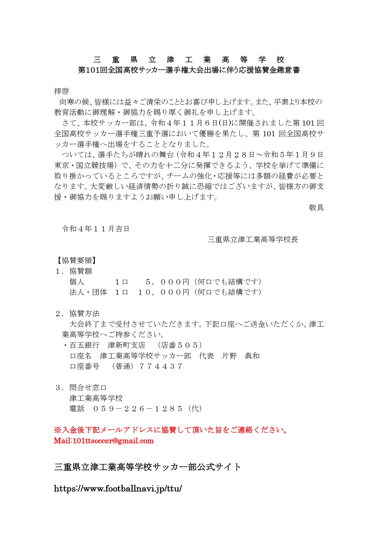 第101回全国高校サッカー選手権大会出場に伴う応援協賛金のお願いについて