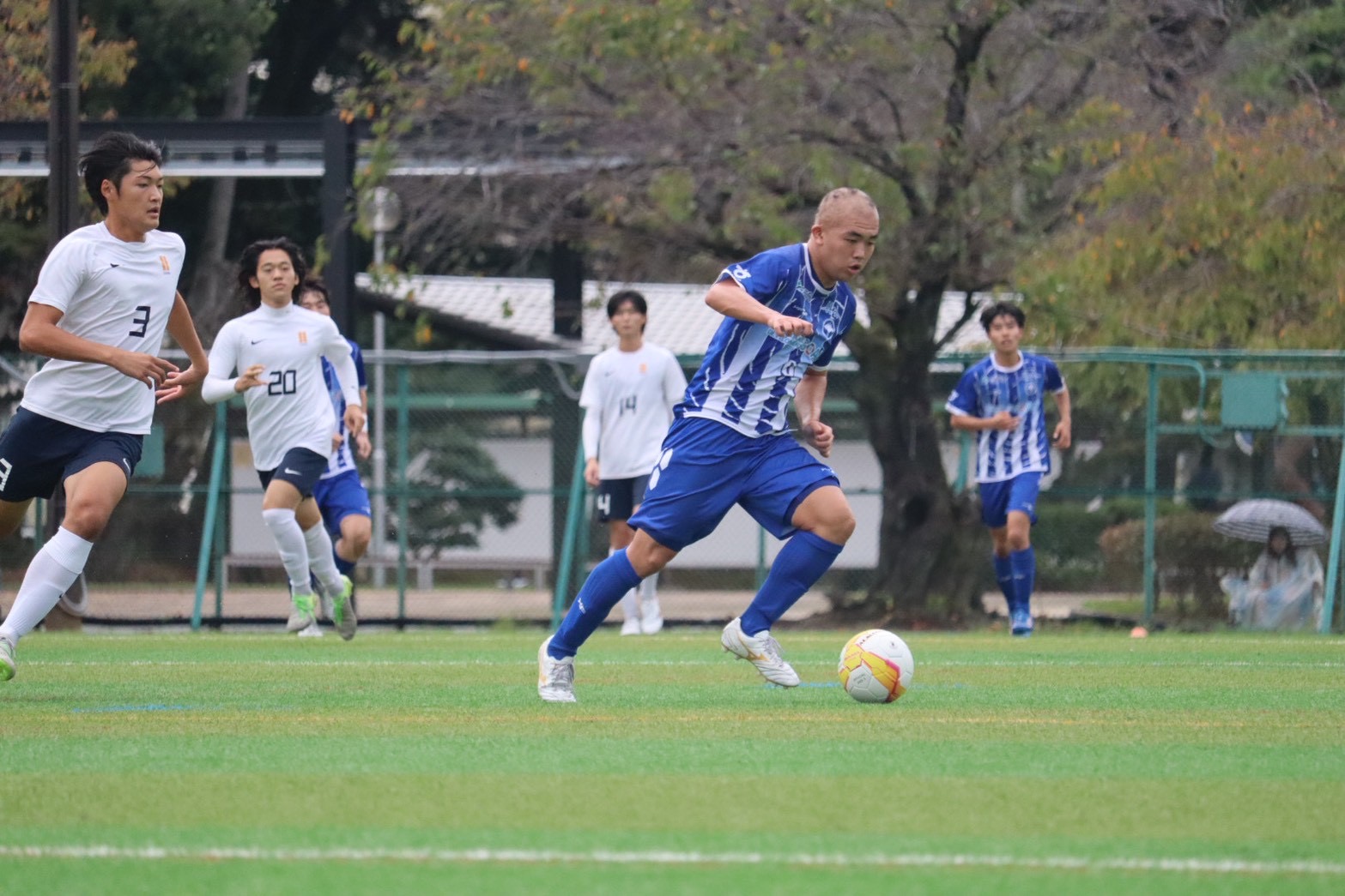 今回は東海学生サッカーリーグ第16節、愛知東邦大学との試合でした。今回の試合は、守備のはめどころをチーム全体で意識して雨の中試合に挑みました。相手は元々東海1部リーグのチームかつ、東海2部リーグ首位ということもあってポゼッションも上手で守備がハマらない時間帯が続き、前半給水までの時間で大量失点をしてしまいました。しかし、途中選手の勢いや選手間で諦めずに話し合って問題点を共有し、改善が見られたシーンもありましたが、相手チームに隙がなく、そこからも追加点を決められてしまい、記憶に残るとても悔しい結果になってしまいました。この経験をなかったことにせず、残り2節に繋げられる試合にしていきたいです。