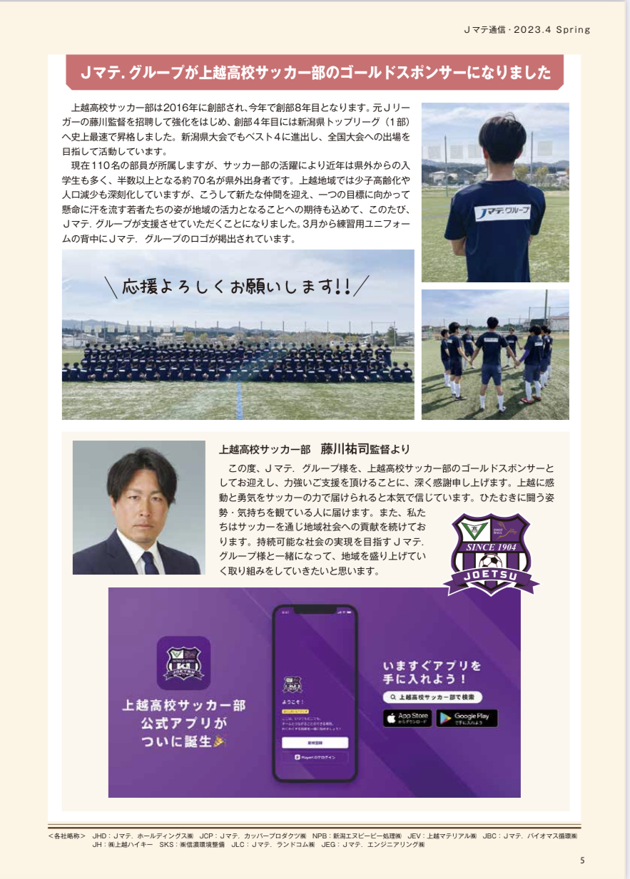 この度、Jマテ.グループ様を、上越高校サッカー部のゴールドスポンサーとしてお迎えし、力強いご支援を頂けることに、深く感謝申し上げます。上越に感動と勇気をサッカーの力で届けられると本気で信じています。ひたむきに闘う姿勢・気持ちを観ている人に届けます。また、私たちはサッカーを通じ地域社会への貢献を続けております。持続可能な社会の実現を目指すJマテ.グループ様と一緒になって、地域を盛り上げていく取り組みをしていきたいと思います。