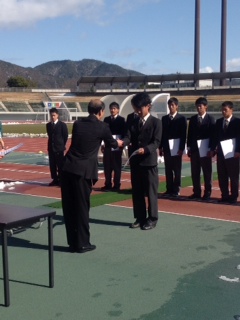 「この賞は、決して自分一人の力でいただいた賞ではありません。部員55名、スタッフの方々、父母の会の方々のおかげだと思っています。特に3年生の宮川。試合前日には必ずみんなに緊張をほぐすメール、試合が終わった後には次の試合に向けたメール。すごく感謝しています。また、色々な人から頑張れよと言って頂いたことがすごく力になりました。とても感謝しています。ありがとうございました。」