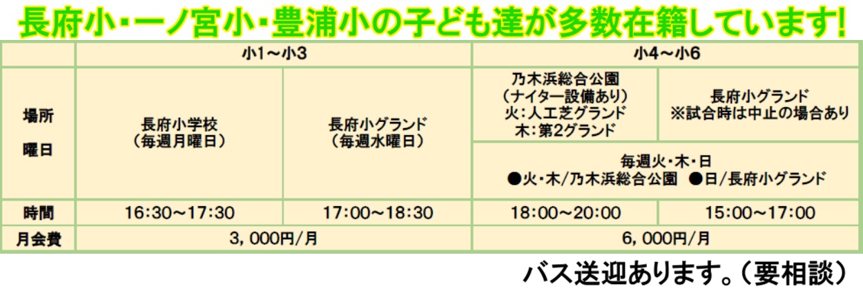| 中学1年〜3年 | [火] 乃木浜人工芝 19:00〜21:00 [木] 乃木浜人工芝(乃木浜第2も有) 19:00〜21:00 [土] 練習・試合 乃木浜第2 15:00〜17:00 (不定期・グランド空状況で場所・時間 変更あり) [日] 練習・試合 長府小 15:00〜 17:00 (場所・時間変更あり)*長期休みを利用し、合宿・遠征あり |