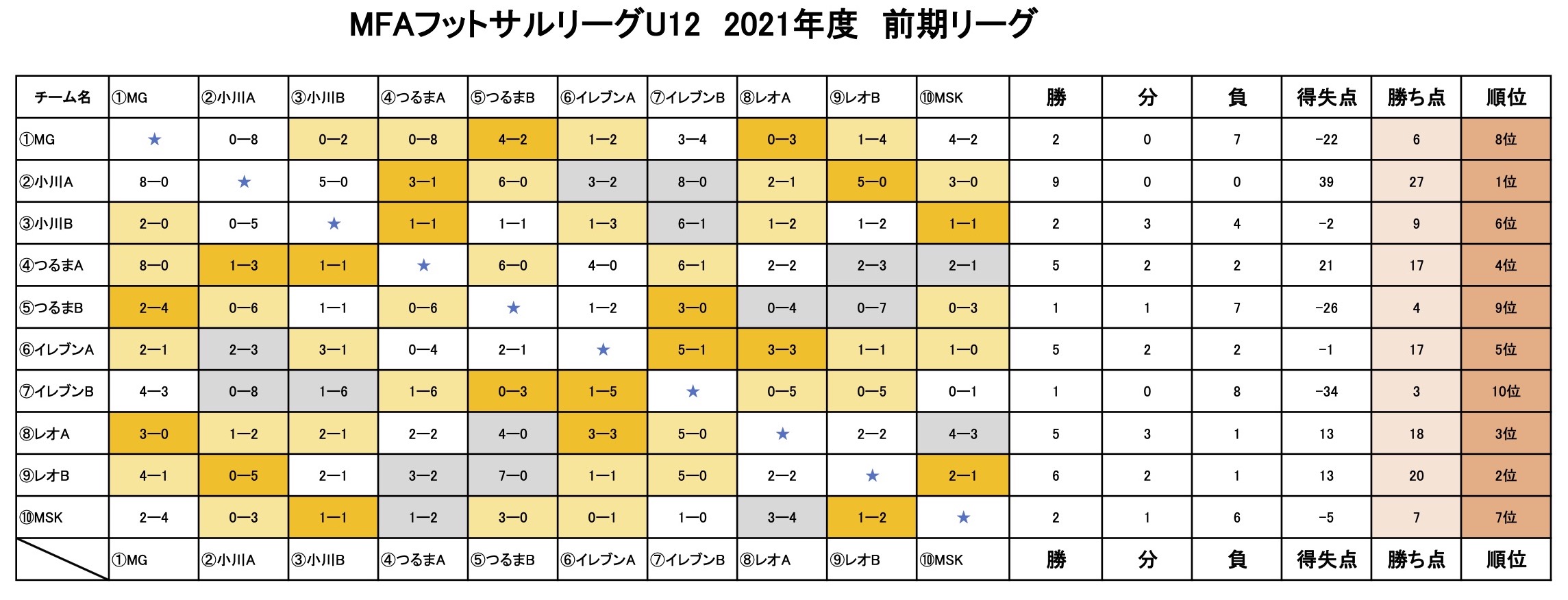 フットサルリーグU-12が15日に開催されましたので結果と、前期リーグの集計、次節1月の予定をアップします。1月からは後期リーグとなり、前期と後期の結果で優勝が決まります。