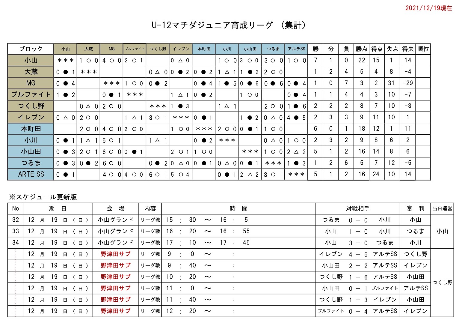 U-12マチダジュニア育成リーグが19日開催されましたので進捗を更新します。年内の予定は終了、年明けより残り14試合となります。