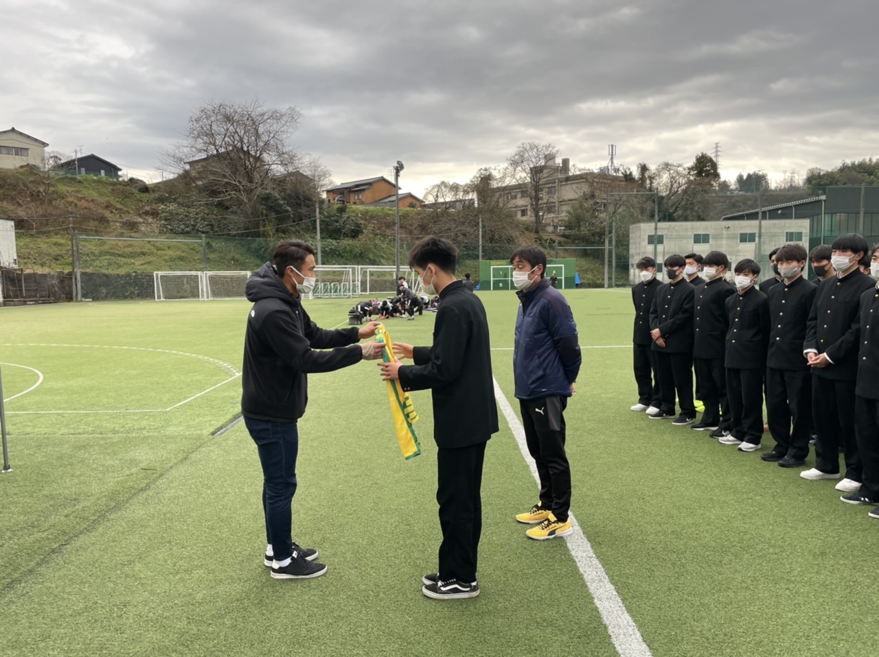 12月16日グラウンドにてOB・OG会会長中村様より、『第100回高校サッカー選手権大会』に向けて新調されたユニフォームとベンチコートをいただきました。