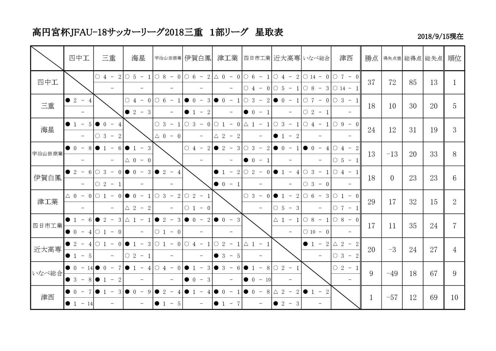 【TOP】高円宮杯JFAU-18サッカーリーグ2018三重1部星取表