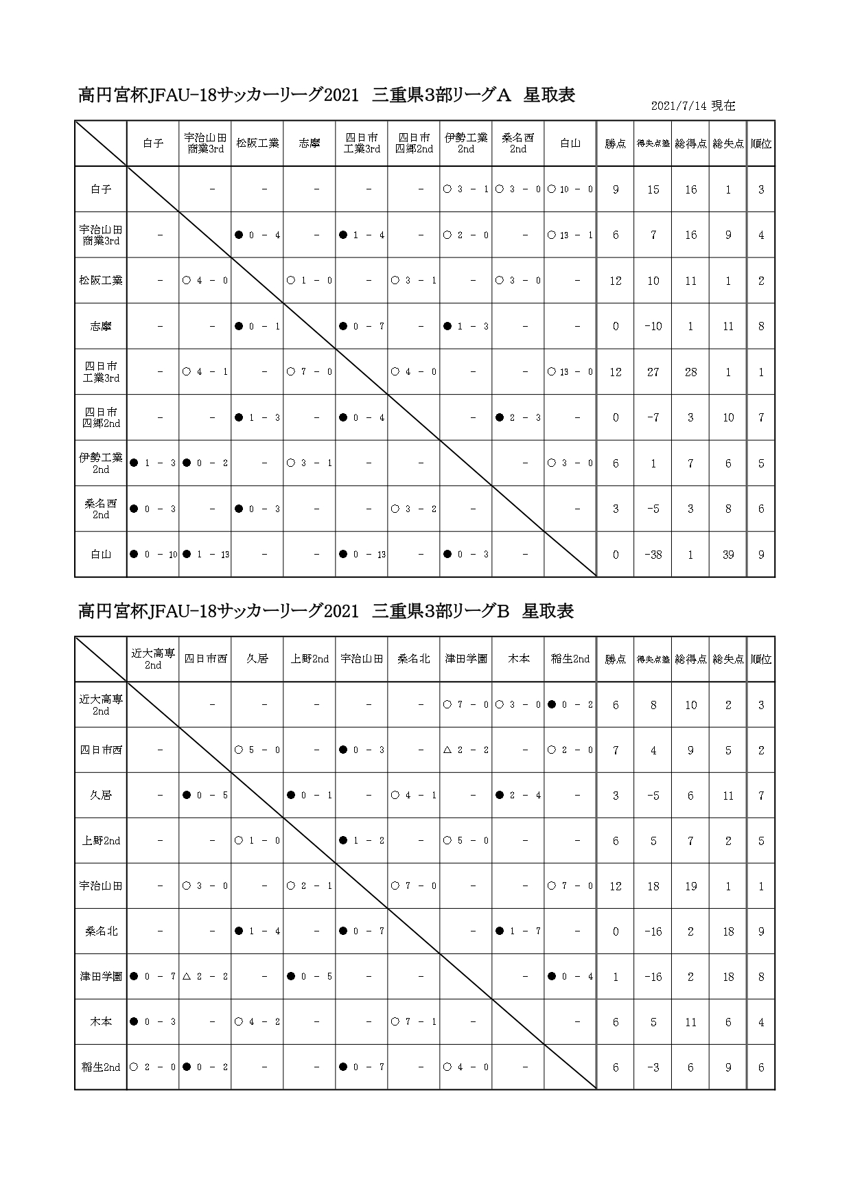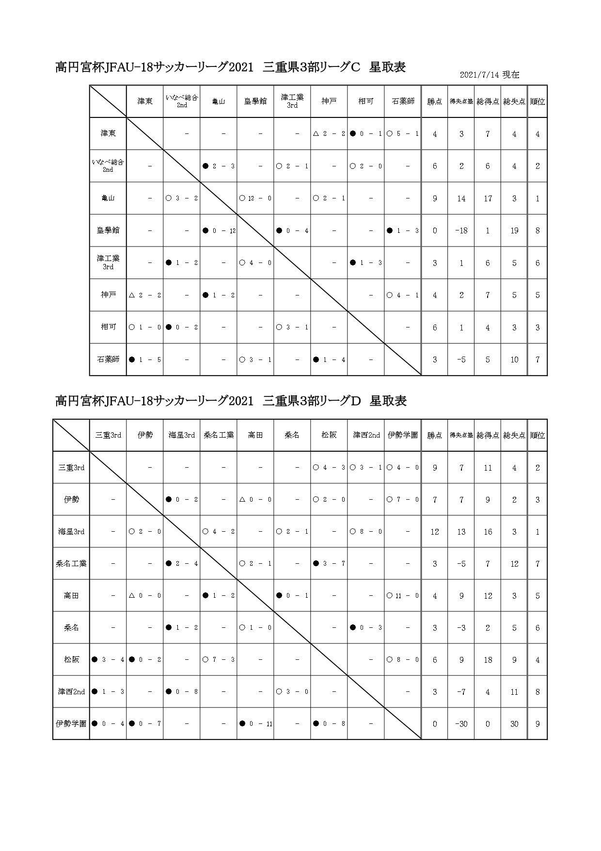 【Sat?】高円宮杯JFAU-18サッカーリーグ2021三重3部 星取表