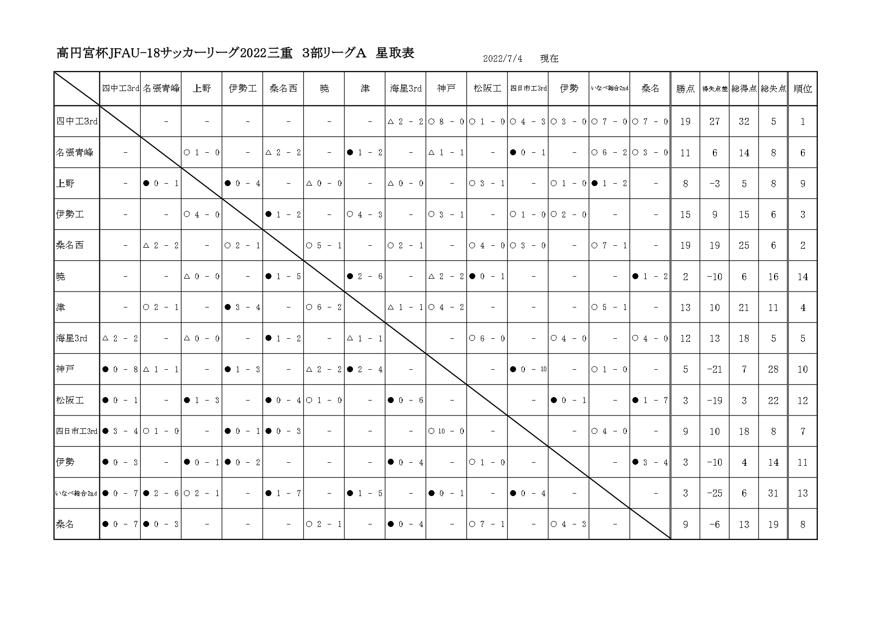 【Sat?】高円宮杯JFAU-18サッカーリーグ2022三重県3部 星取表