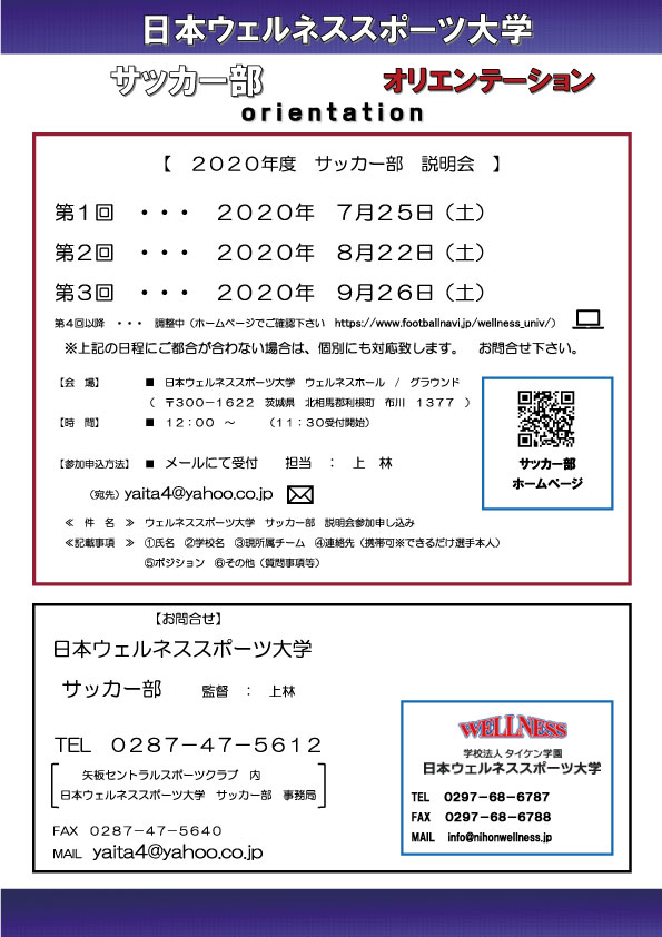 サッカー部 説明会 【期日】9月26日(土) 【会場】日本ウェルネススポーツ大学 【時間】12:00〜 (11:00受付開始)